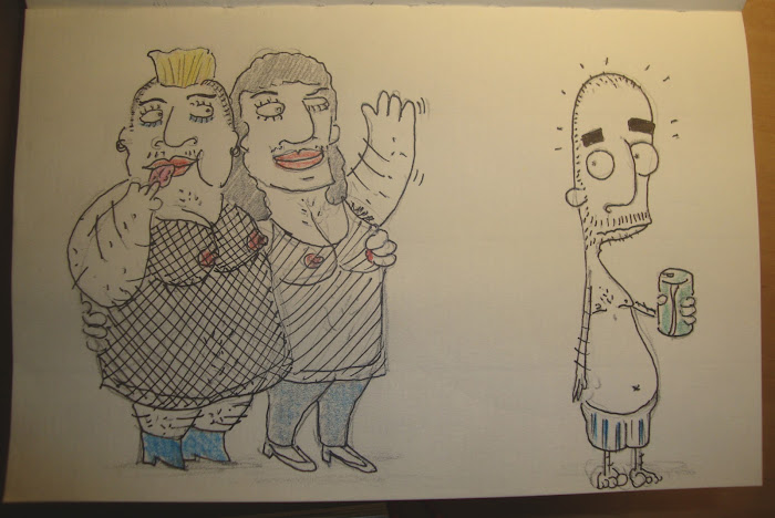 naturalmente la solita fortuna di stupid dave. oh patria della birra, oh patria del bratwurst! in un minispazio dedicato ai fumatori chi ti incontra? un bel paio di TRAVONI improponibbbbili! ma veramente brutti: grassi, pelosi, baffuti, coi supertettoni as usual, supercapezzolati! uno con la cresta punk alla Rihanna, l'altro alla Cher. non potete capire la bruttezza, mi spiace per loro. ma soprattutto per stupid dave che attraverso i loro vestitini a rete ha visto tutto e di più, aaaaaaaaaaaaargh!