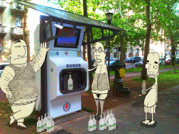 tessera sanitaria e bottiglia di plastica vuota si appresta a godersi un litrozzo d'acqua bella fresca per trarre beneficio di fronte alla caldazza milanese. appena arrivato alla casa dell'acqua, cosa nota? una