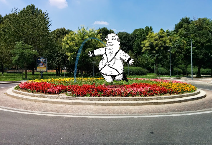 Sadomasokino non sa più cosa inventarsi per rovinare la giornata dei milanesi! Anzi sì, è pieno di risorse: decide di piazzarsi a mò di fontana in una rotonda fiorita. Sappiamo già che quei bei fiori appassiranno ben presto!