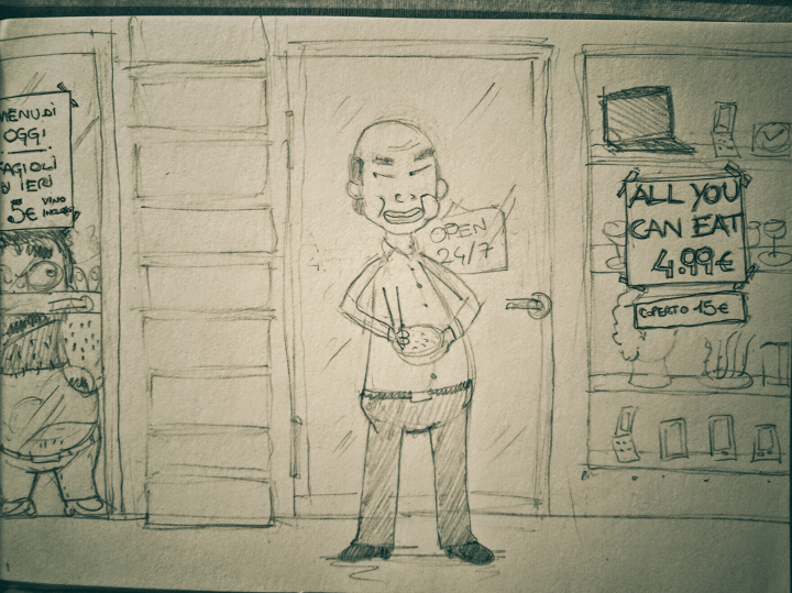 Mario Hu è un vero imprenditore. Nella sua bottega "Hu Trading" c'è anche spazio per la ristorazione: "All you can eat" a soli 4.99 euro, un'offertona per gli stolti che non riescono a leggere le righe più piccole del cartello, Ma c'è qualcuno che non è proprio contento di questa concorrenza sui prezzi. Sulla qualità, beh, lasciamo stare per entrambi che è meglio...