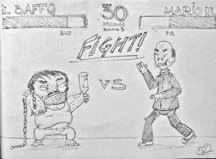 In omaggio ai classici picchiaduro dei primi anni 90 (che guardavo sbavando in sala giochi), continua la singolar tenzone tra i vicini di saracinesca, il baffo e Mario Hu. Chi vincerà in questo terzo round?