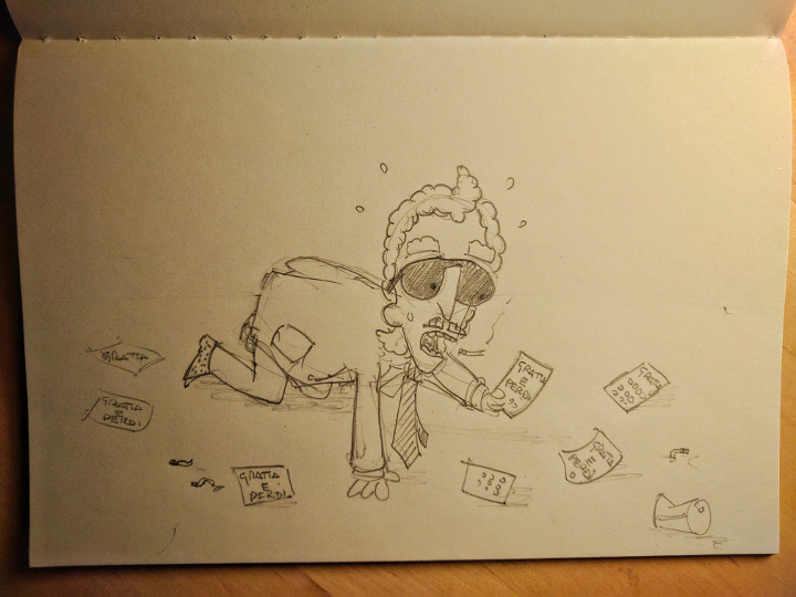 Eccolo il cummenda di prima mattina che esce dal bar dopo un cafferino: incedere supponente, parlantina fastidiosa già di prima mattina. "Ciao bella gente, todo bien? Ammazza che brutti... Lavorate, lavorate! Ahahahahahah!". La verità è ben altra cosa, caro il mio cummenda. Fino a pochi minuti prima intento a cercare sul pavimento lercio del locale un grattino vincente per iniziare bene la giornata e invece nulla. Continua, continua a fare il ganassa, prima o poi una bella ripassata non te la toglie nessuno.