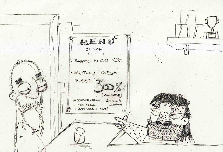 Dopo aver accettato il preventivo di un notaio (ovviamente il più basso tra i cinque confrontati!), Stupid Dave è alle prese con la scelta del mutuo. Scelta... Diciamo "valutazione" del cappio trentennale: tasso fisso, tasso variabile, spread, spese d'istruttoria, imposte, assicurazioni scoppio/incendio/invalidità/morte/resurrezione, ricerche online. Ma forse, italian way, la ricerca tramite conoscenze può essere l'arma in più? O no? Attento Dave, arma rettale!