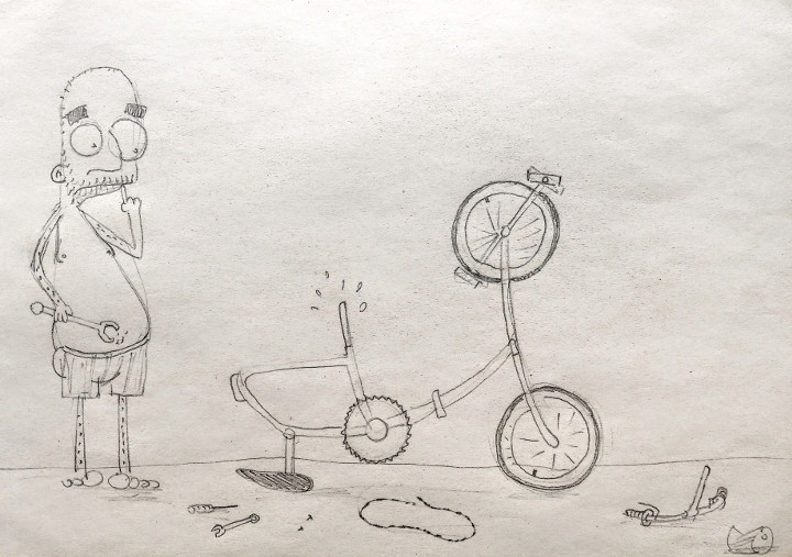 "Niente, devo allentare il dado vicino ai pattini, vabbè, cosa ci vuole?". "Ah, il filo del freno adesso è uscito dal canale, adesso lo reinfilo.". "Osti... il freno adesso non frena più tanto bene. Ah, la molla è storta, spè che la sostituisco!". "Cavolo, questo dado è lì da 50 anni, devo riuscire a toglierlo per sostituire tutto il blocco.". "Mmmmm... Mi ci vuole un cacciavite che faccia l'angolo, lo compro e continuo domani.".
