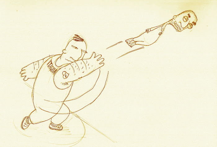 per quanto accaldati dall'afa milanese, alcuni dei nostri eroi si cimentano in una ancora sconosciuta disciplina: il lancio del cretino. chi meglio di stupid dave potrebbe rivestire il ruolo del proiettile (o _PIRL_ettile) umano? da notare lo sguardo impegnato mentre fende l'aria orgoglioso, pronto a schiantarsi, in fase di discesa, all'interno di qualche cassonetto maleodorante. chi meglio di ivan avrebbe potuto scagliare nell'aria un assoluto idiota? vero spirito olimpico, non l'ha neanche (per ora) malmenato a sangue.